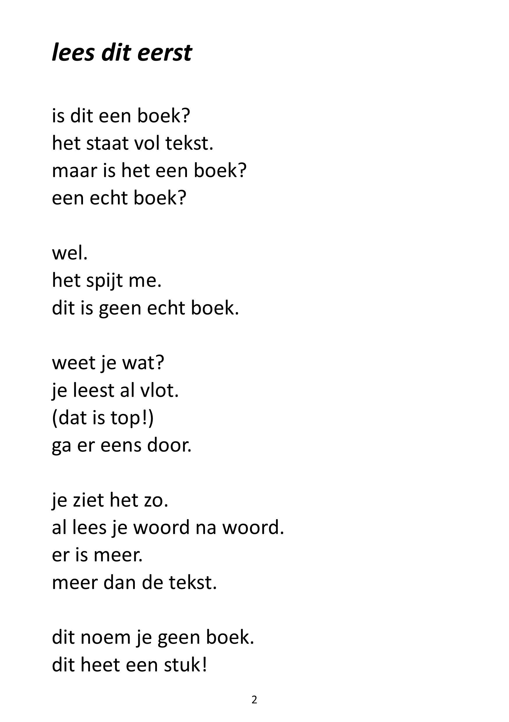 In de tekst van bijna tweeduizend woorden komen vooral korte zinnen voor. De bijbehorende woordenlijst telt 350 éénlettergrepige woorden. Nagenoeg alle tweeklanken komen aan bod net als de meeste combinaties van dubbele medeklinkers, zowel vooraan als achteraan het woord. Hier en daar worden er ook al eens drie opeenvolgende medeklinkers geserveerd.