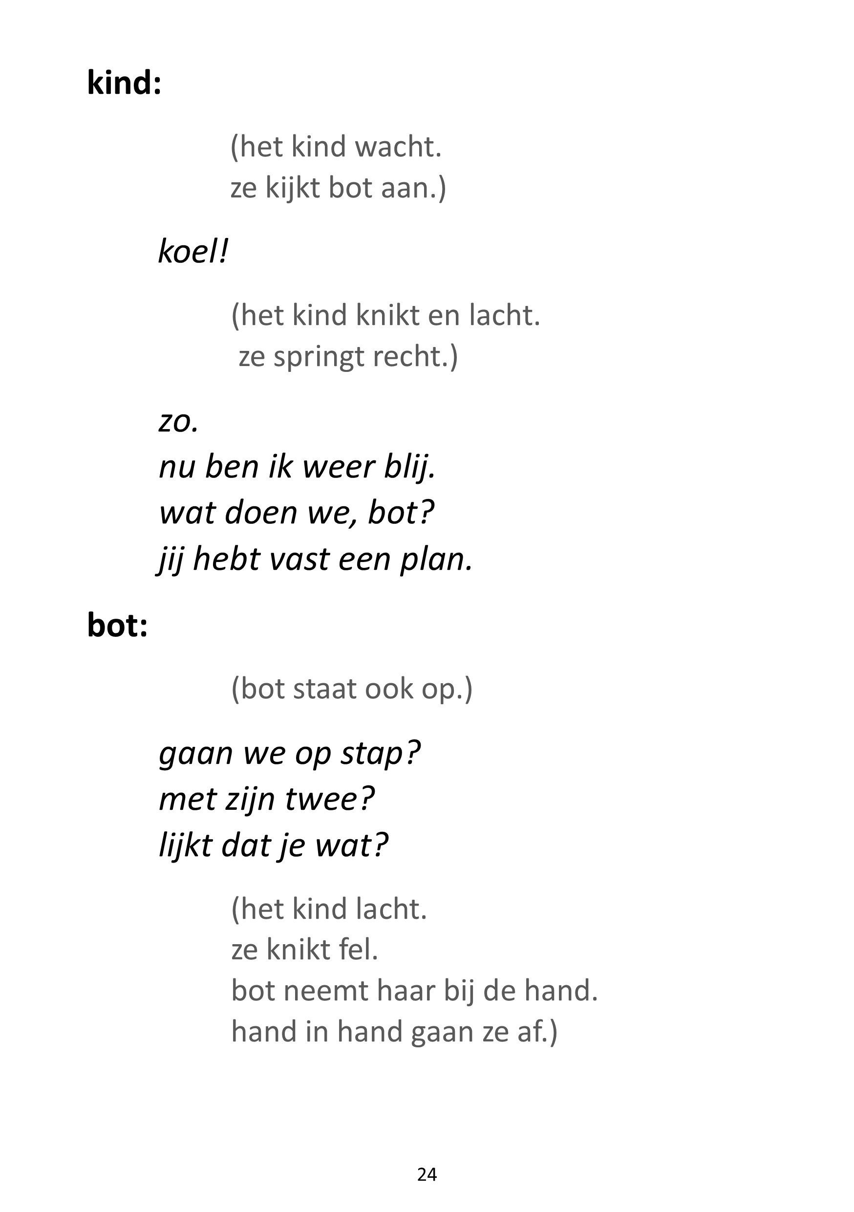 Dit is het eerste toneelstukje uit de reeks. In de tekst wordt eerst uitgelegd wat de bedoeling is en hoe een stuk zich onderscheidt van een gewone tekst. Vervolgens wordt de situatie van het kind en de bot kort toegelicht. Ten slotte volgt het scenario.